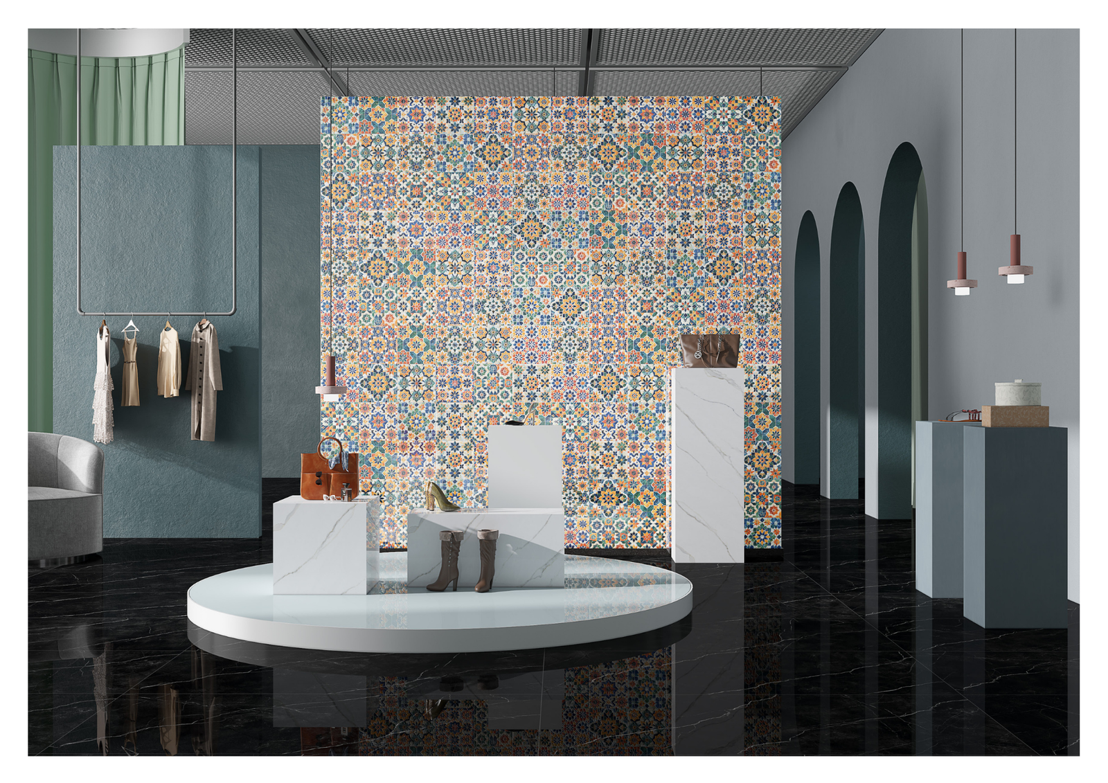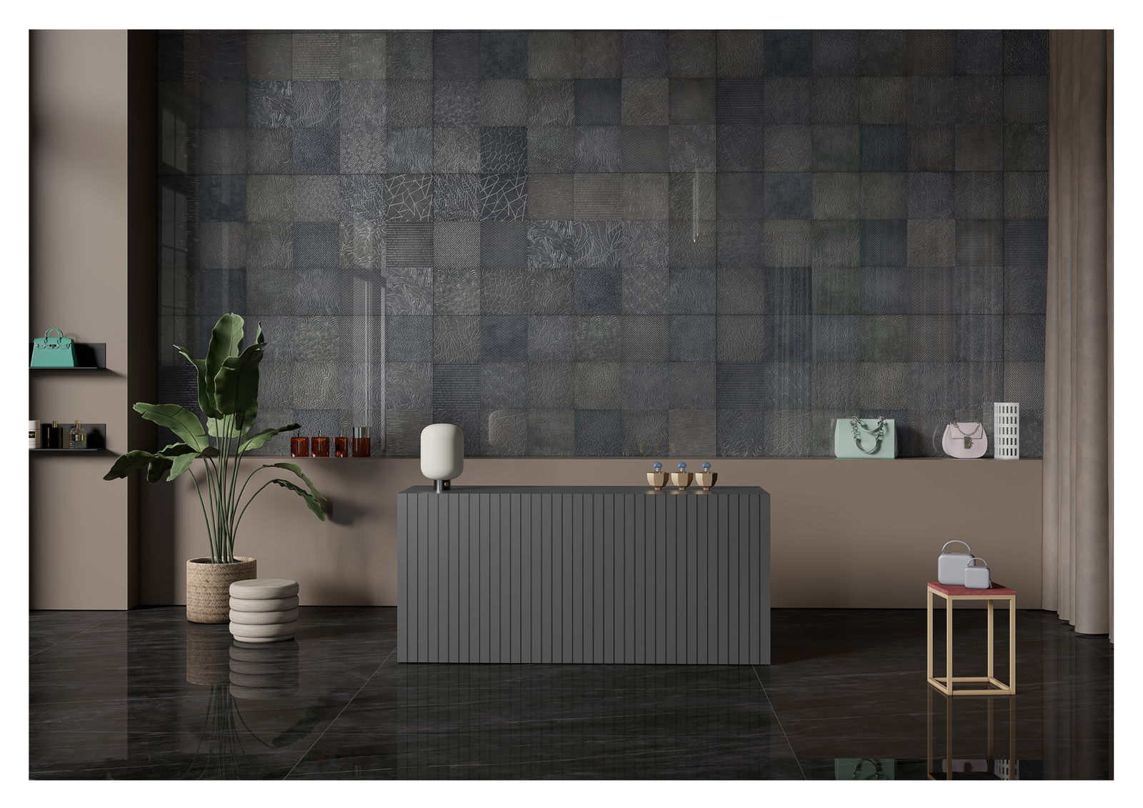 Each design is a masterpiece, with rich textures, refined tones, and a finish that reflects pure sophistication. From the soft glow of pearl-like whites to the striking drama of deep onyx, these tiles transform every surface into a work of art.